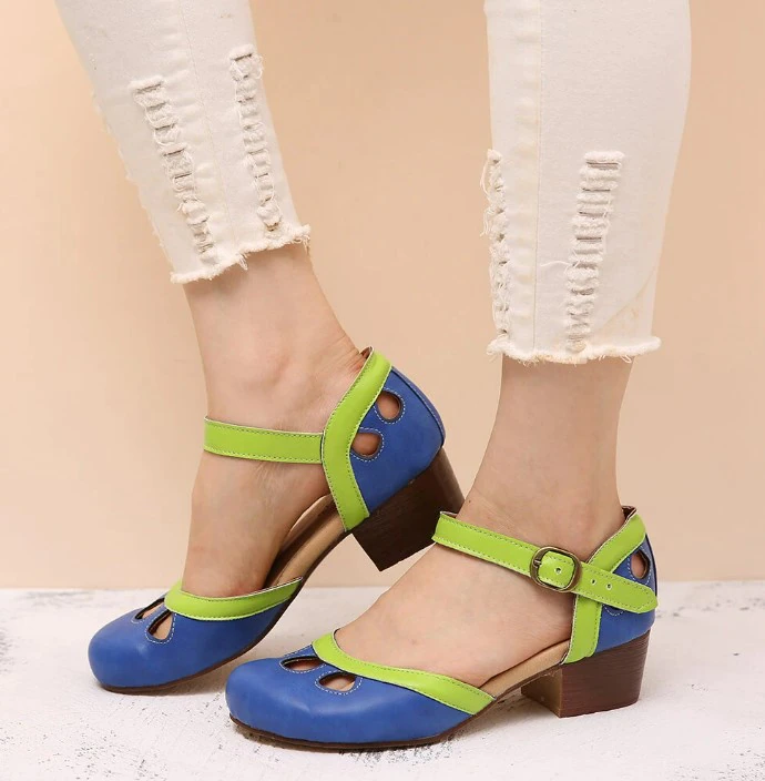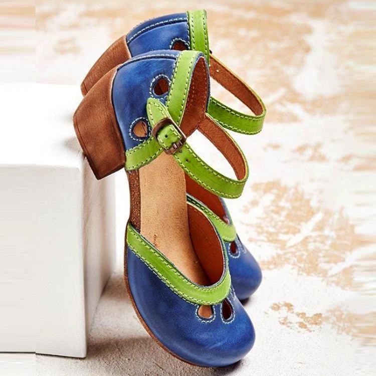 Qengg Buckle Cute Mary Janes Pumps Women Cutout Rome Round Toe Casual Office Comfy Summer High Heels Shoes Chunky Heels Pumps