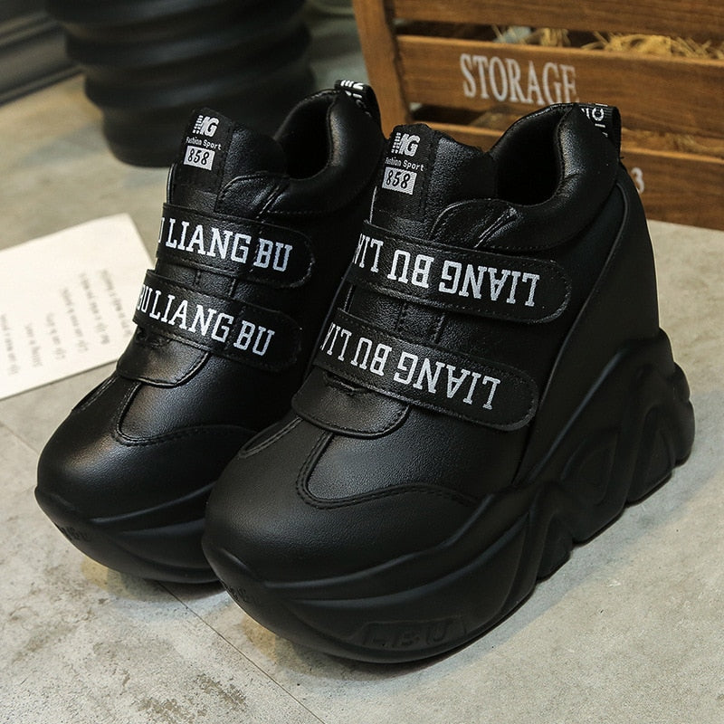 12 Cm Super Hign Wedge Sneakers Woman Auutmn 2018 Leahter Female Casual Shoes Hook Loop Comfortable Platform Sneakers