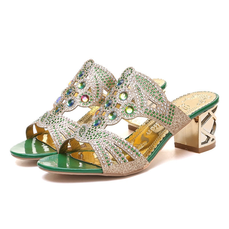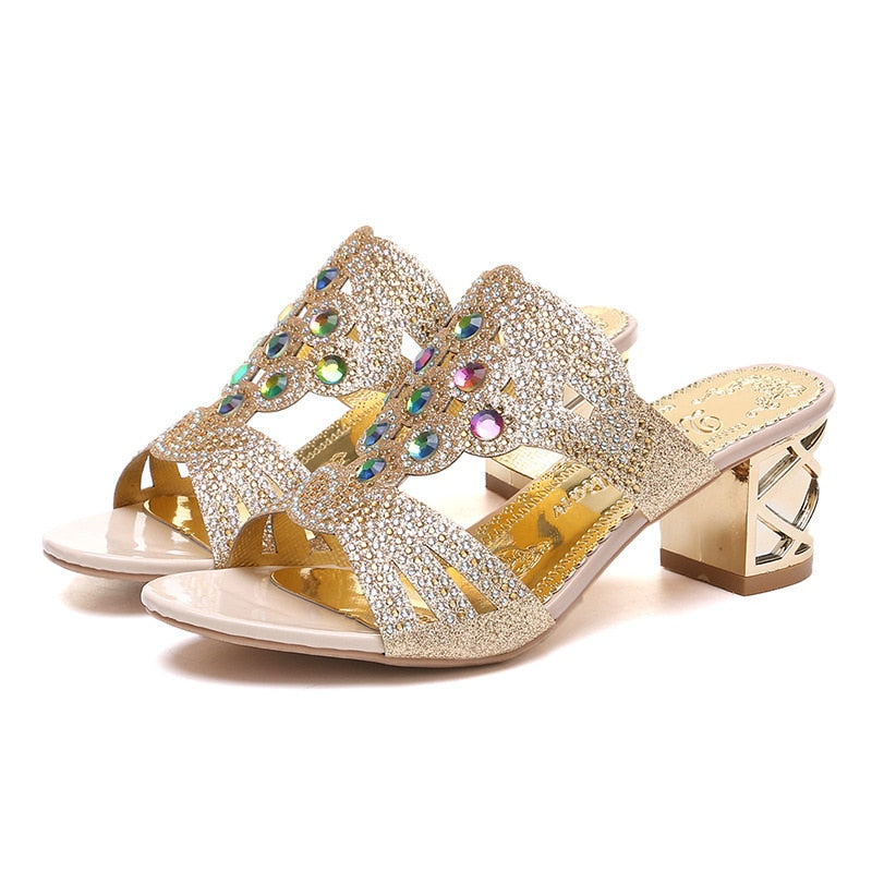 2020 Glitter Mesh Women Sandals Summer Fashion Peep Toe Casual Slippers Thick Heel Women Shoes Slip On Big Size 35-41