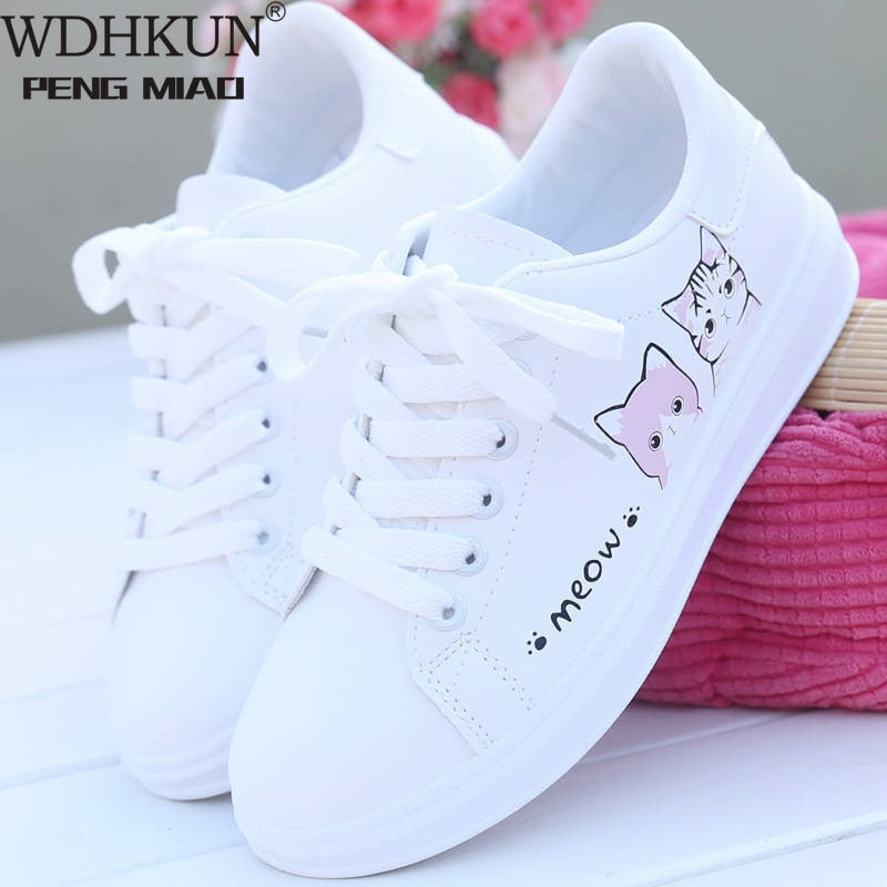 2020 New Arrival Fashion Lace-up Women Sneakers Women Casual Shoes Printed summer Women Pu Shoes Cute Cat Canvas Shoes