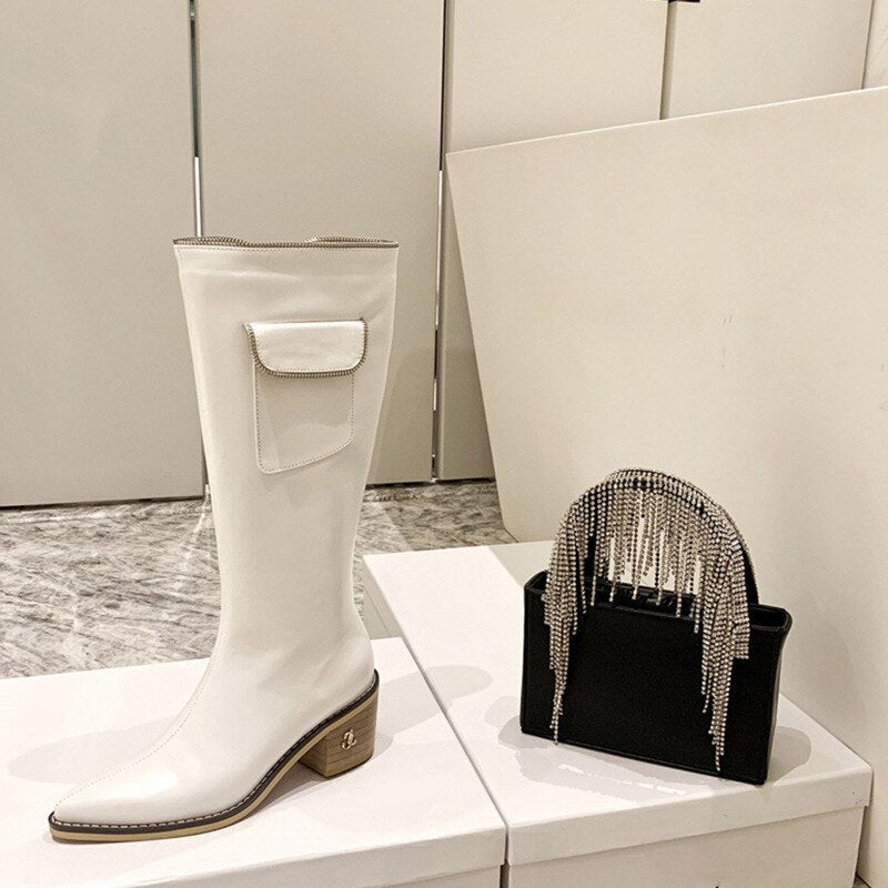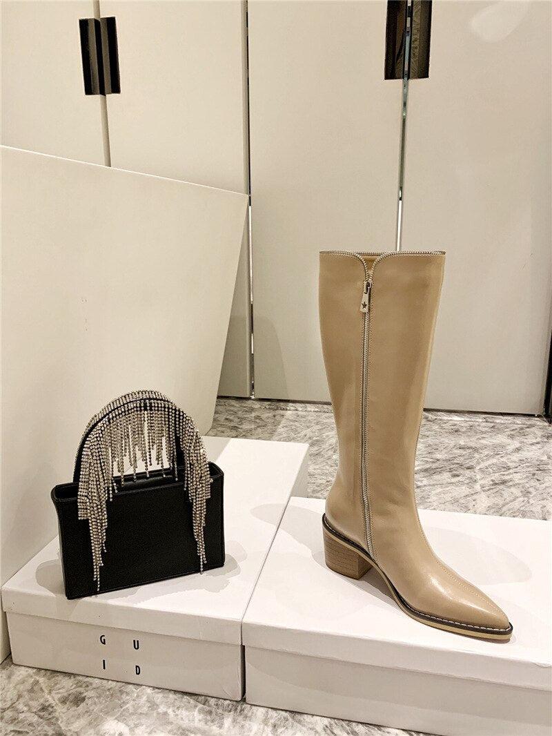 2021 Brand Design Winter Square Heel Knee High Boots Women Pointed Toe Chelsea Boots Leather Pocket Zipper Boots Botas Mujer