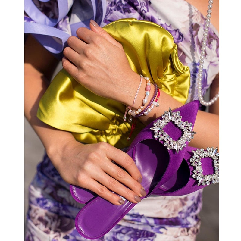 2021 European and American Style Closed Toe Niche Design Rhinestone High Heel Shoes Women's Summer Satin Mid Heel Slippers