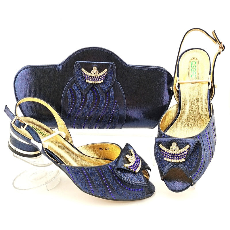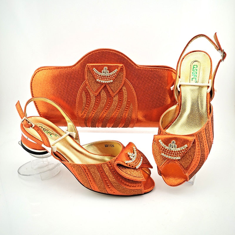 2021 Italian Design New Arrival Summer Low Heels Fashion Style Nigeiran Party Wedding Women Shoes and Bag Set in Gold Color