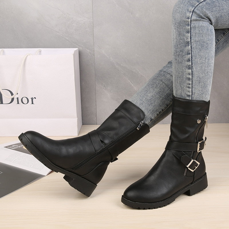 2021 Mid-Calf Boots Plus Size 43 Women Buckle Goth Boots Female Low Square Heel Zipper Leather Flat Shoes Red Black Grey Boots