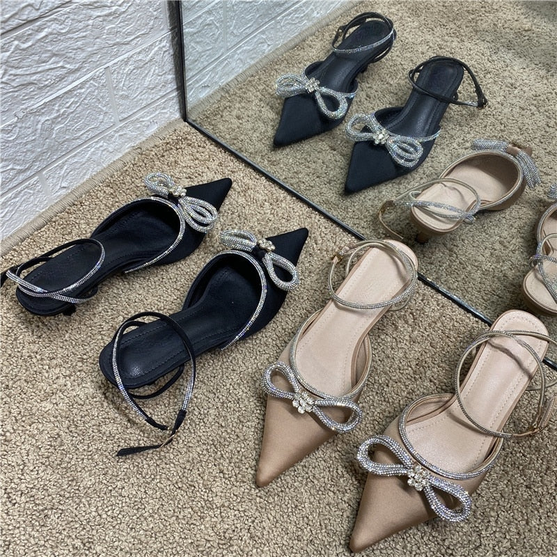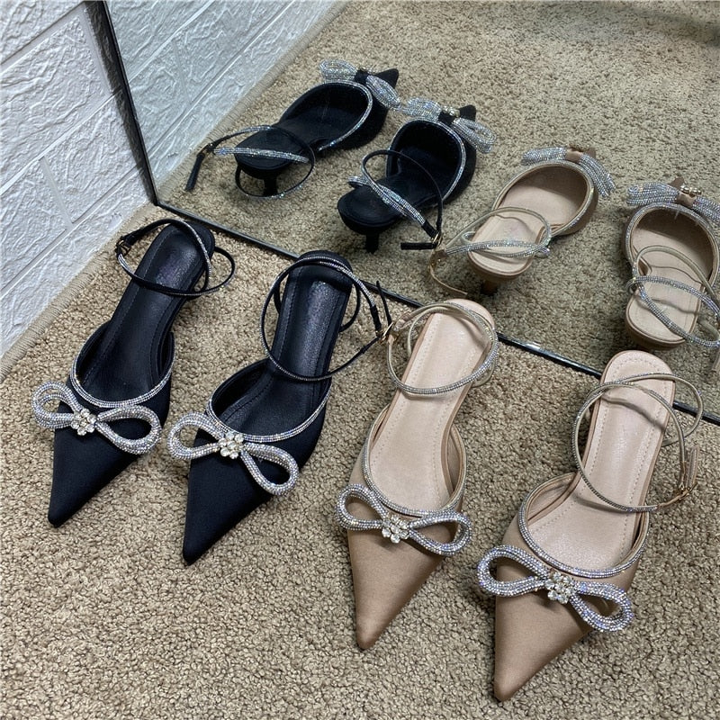 2021 New Buckle Stiletto Heel High Heels Pointed Toe Rhinestone Bow Bandage Sandals