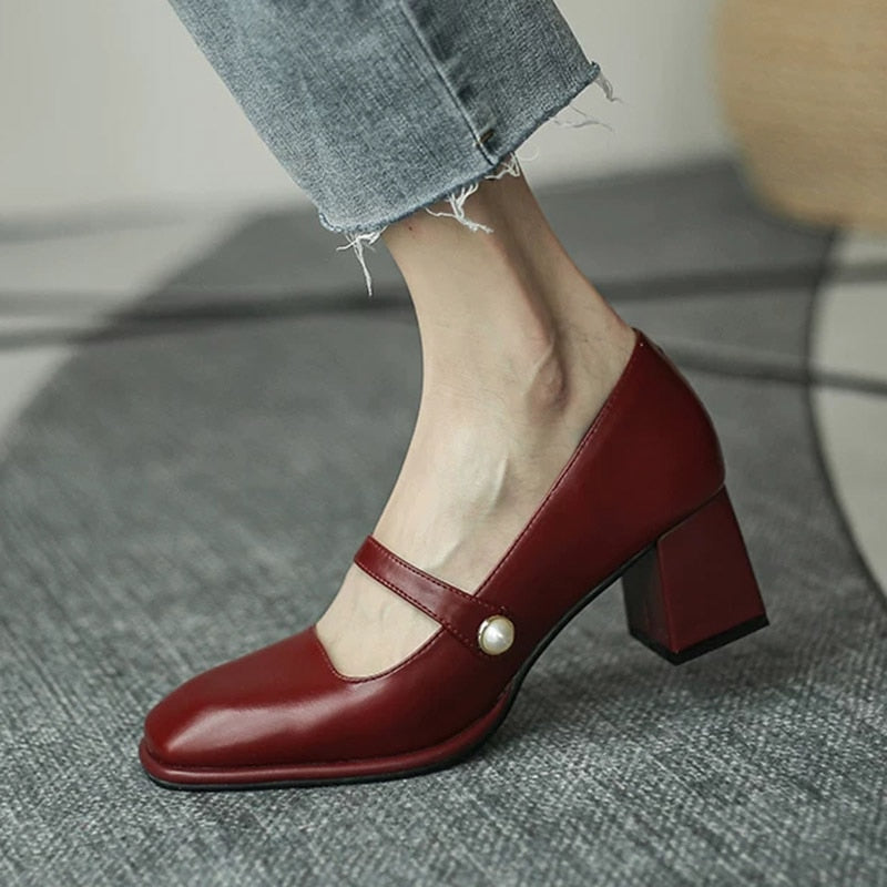 2021 New Fashion Women Shoes Square Toe Mary Janes Shoes Square Heel Dress Shoes Pearl Buckle Pumps High Heels Office Shoe 8557N