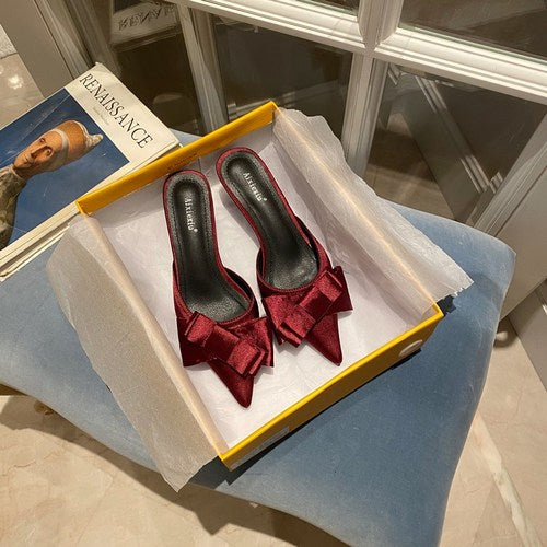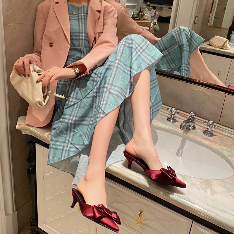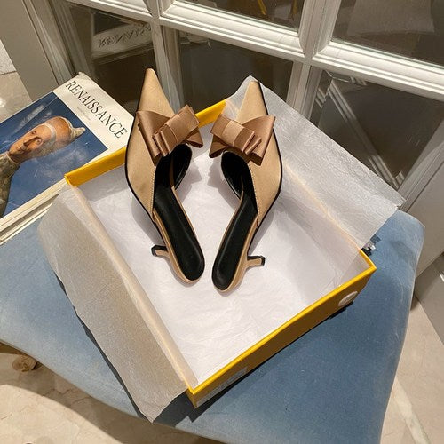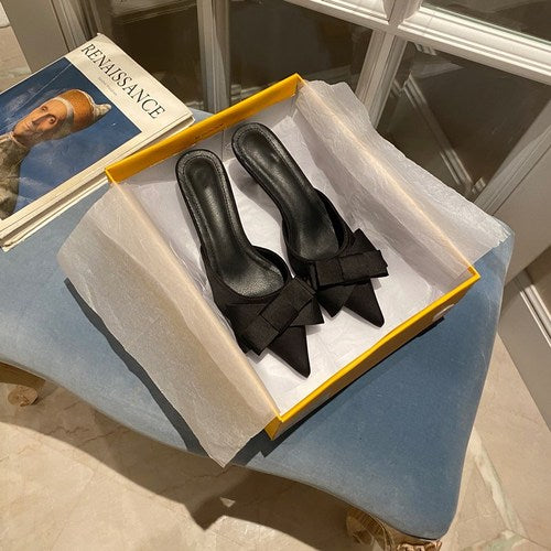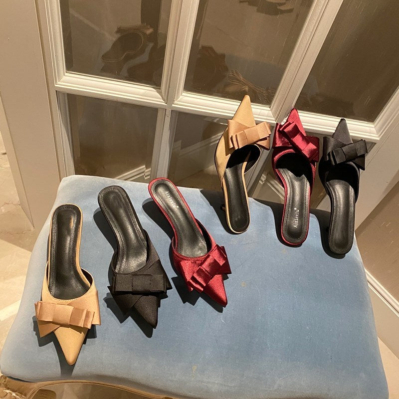 2021 New Semi-trailer Women Wear Fine-heeled Pointy Fashion Joker Bow High-heeled Slippers