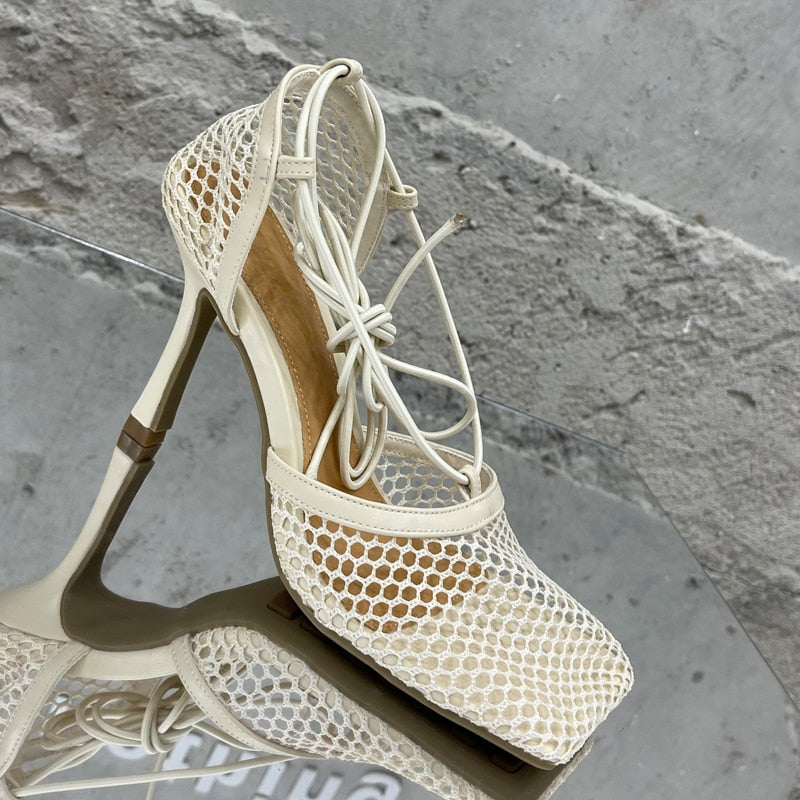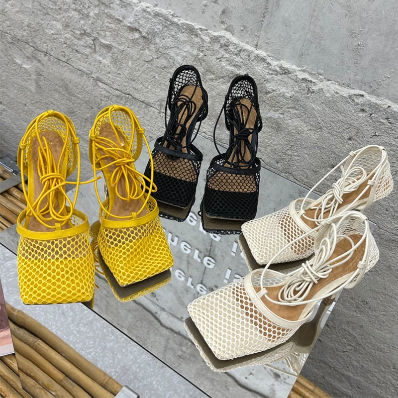 2021 Women Pumps Thin High Heels Sexy Sandals Shoes For Woman Fashion Square Toe Mesh Ankle Strap Pumps Sandals Ladies Shoes