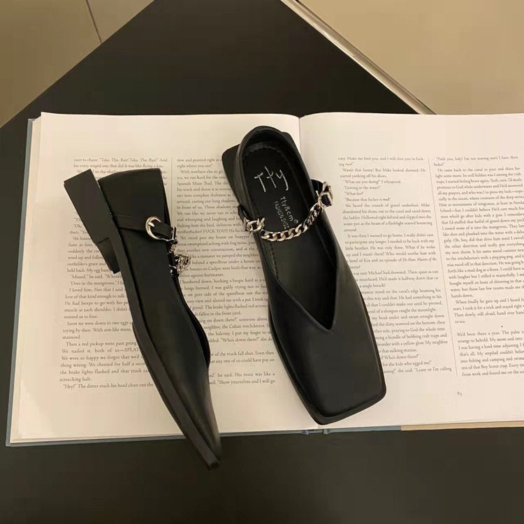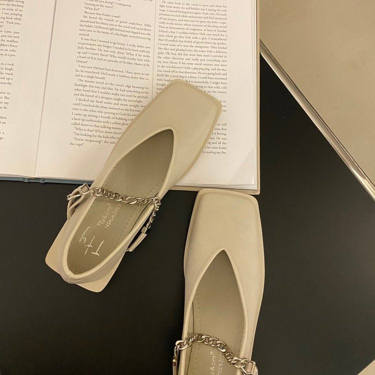2022 Deformed Heel Autumn Luxury Chain Square Head Shallow Flat Shoes Women's Lazy Loafer Casual Flat Square Heels