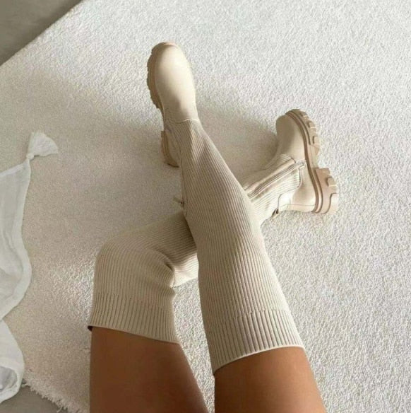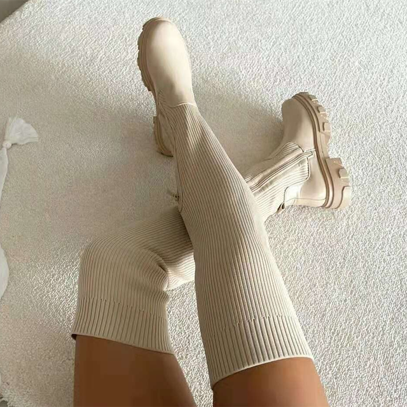 2022 Flats Shoes Thick Sole Boots Autumn Winter Breathable Knitting Upper Women Thigh High Boots Stretch Round Toe Black Boots