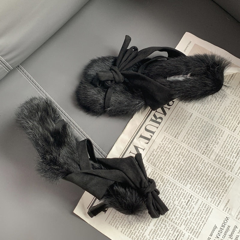 2022 New Brand Chic Fluorescent green Plush Fur Fuzzy Sandals Women Low Thin Heels Fashion Clip Toe Ankle Lace Up Slides Shoes