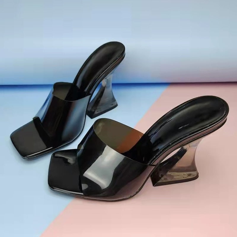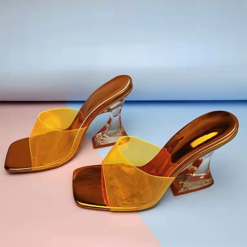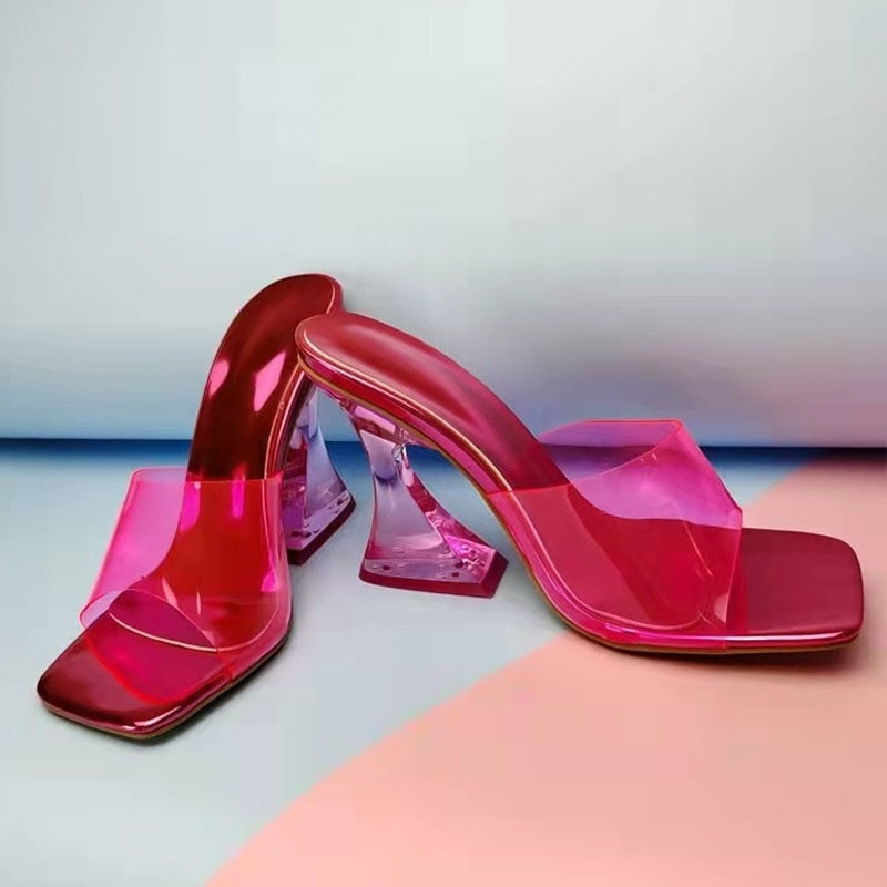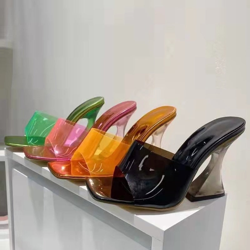 2022 New Clear Slippers Women Heels Sexy Square Toe High Heeled Shoes Fashion Green PVC Transparent Jelly Sandals Size 35-42