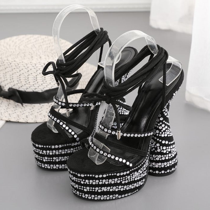 2022 New Lace Up Platform Sandals Women Fashion Open Toe Thick Bottom Crystal Strange High Heels Nightclub Stripper Shoe Size 42