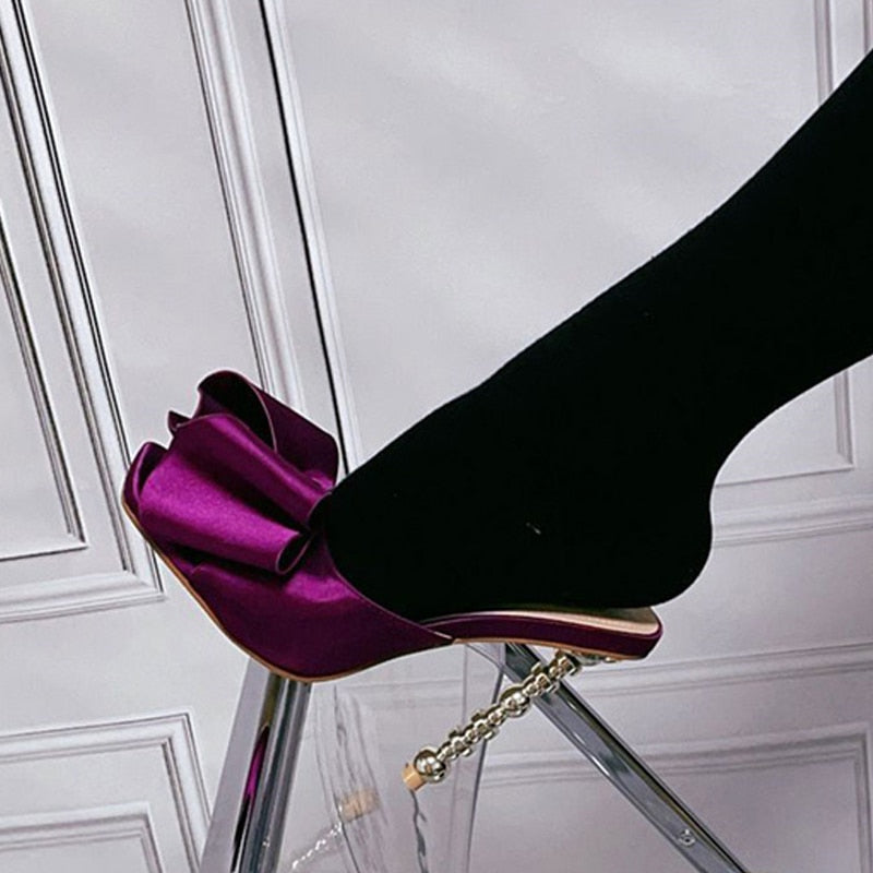 2022 New Purple Silk Butterfly-Knot Women Sexy Slippers Fashion Strange High Heels Sandals Square Toe Mules Slides Party Shoes