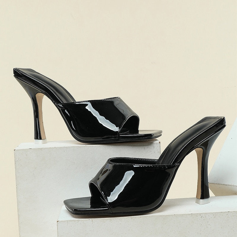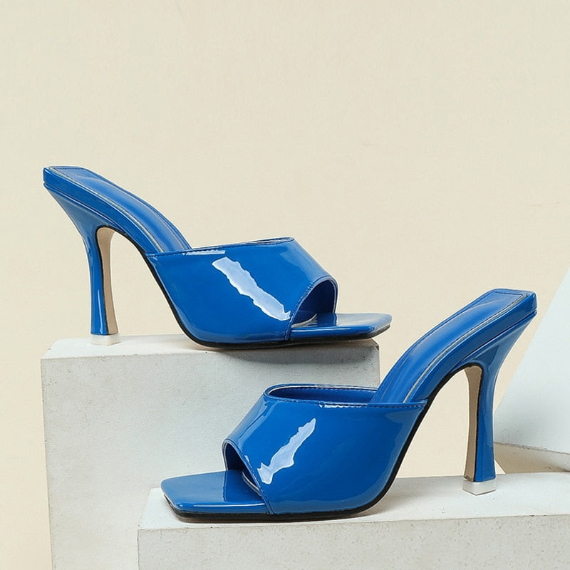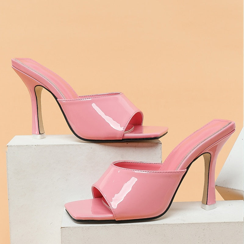 2022 New Summer Slippers Pink Patent Leather Square Toe Thin High Heels Fashion Shallow Mules Sliders Shoes Women Sandals Pumps