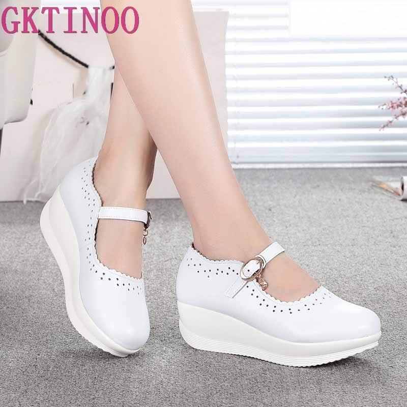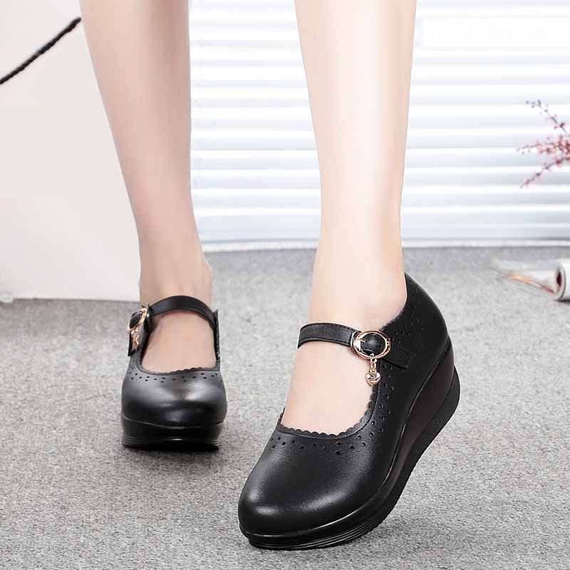 2022 Spring Real Leather Shoes High Heels Round Shallow Mouth Women Shoes Wedge Leisure White Nurse Mom Shoes Shoes Size 33-43