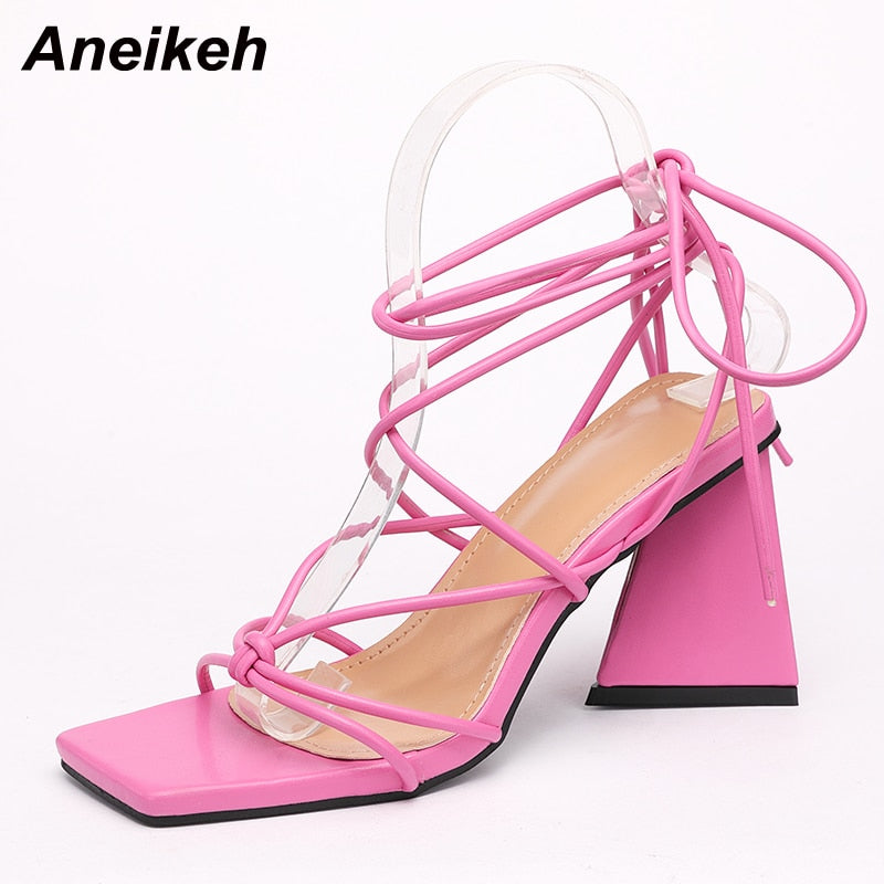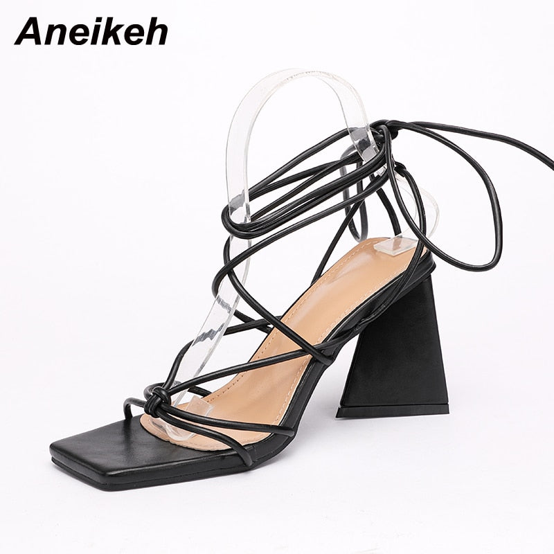 Aneikeh 2022 Fashion Solid Square Open Toe Summer Sandals PU Ankle Cross-Tied Mid Heel Women Shoes Concise 35-42 Zapatos Mujer