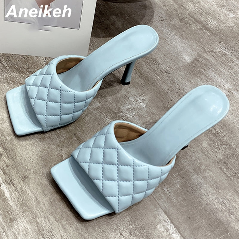 Aneikeh NEW Sexy PU Diamond Square Head Peep Toe Thin High Heels Slippers Summer Fashion Slip On Slides Women Mules Party Shoes