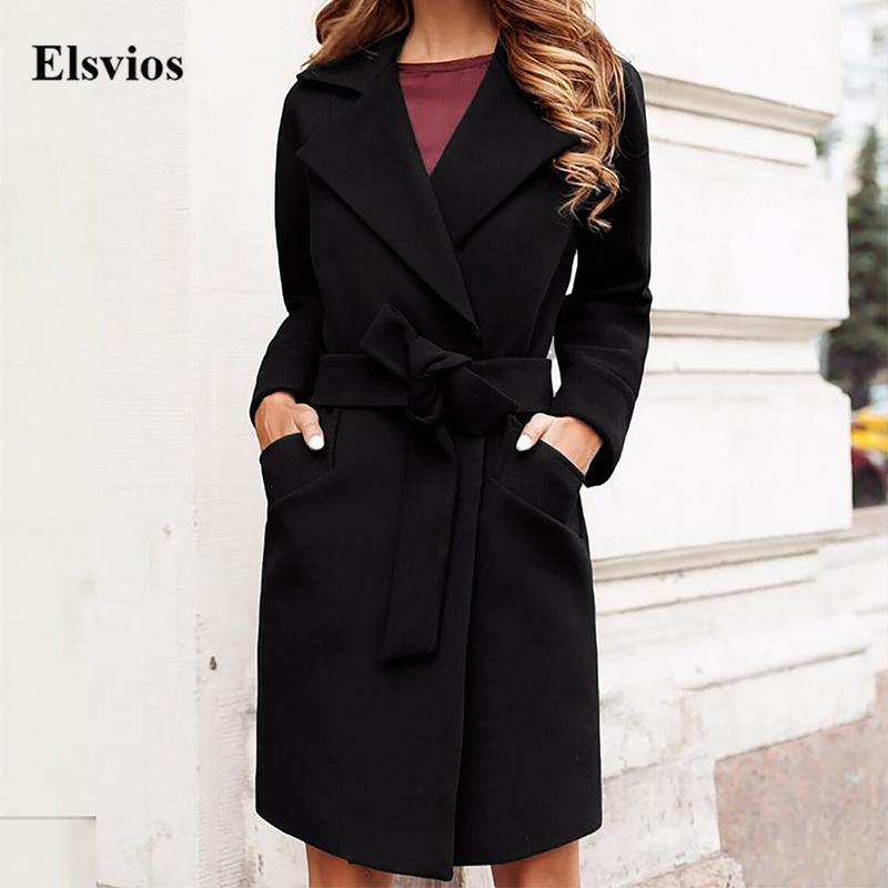 Autumn Office Turn-down Collar Lady Overcoat Fashion Simple Pocket Solid Belted Cardigan Outwear Winter Long Sleeve Women Coats