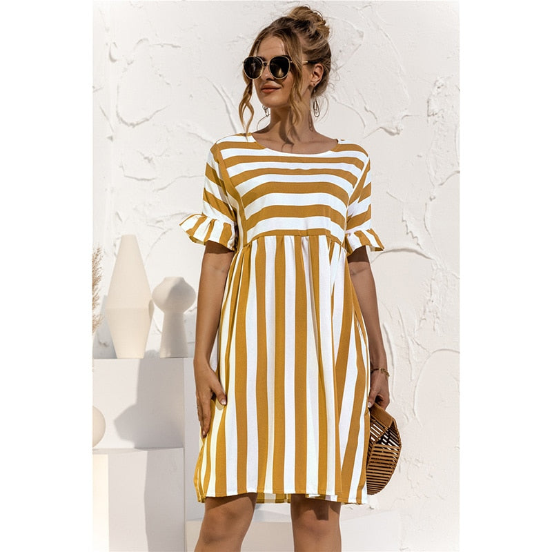 Back to school  Women Elegant Ruffle Sleeve Striped Patchwork A Line Dress 2022 Summer Casual High Waist O Neck Loose Pocket Dress Beach Wear