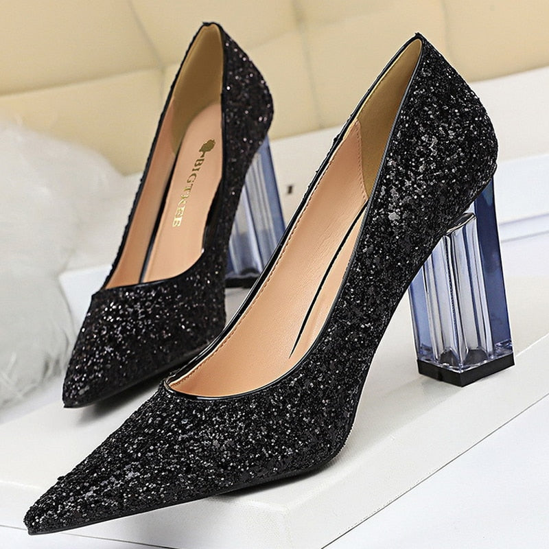 BIGTREE Shoes Transparent Heels Women Pumps Sequins Wedding Shoes Square Heels Women Shoes Crystal Heel Sexy Heeled Shoes 2021