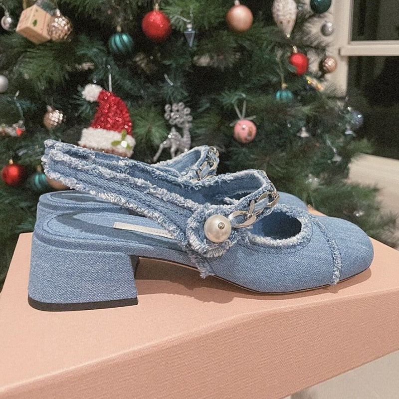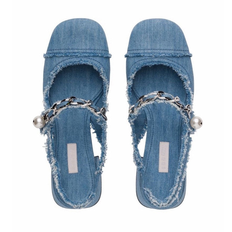blue denim cloth sandals metal chains summer shoes woman square toe med-high heels jeans sandalias mujer 2022 mary janes shoes