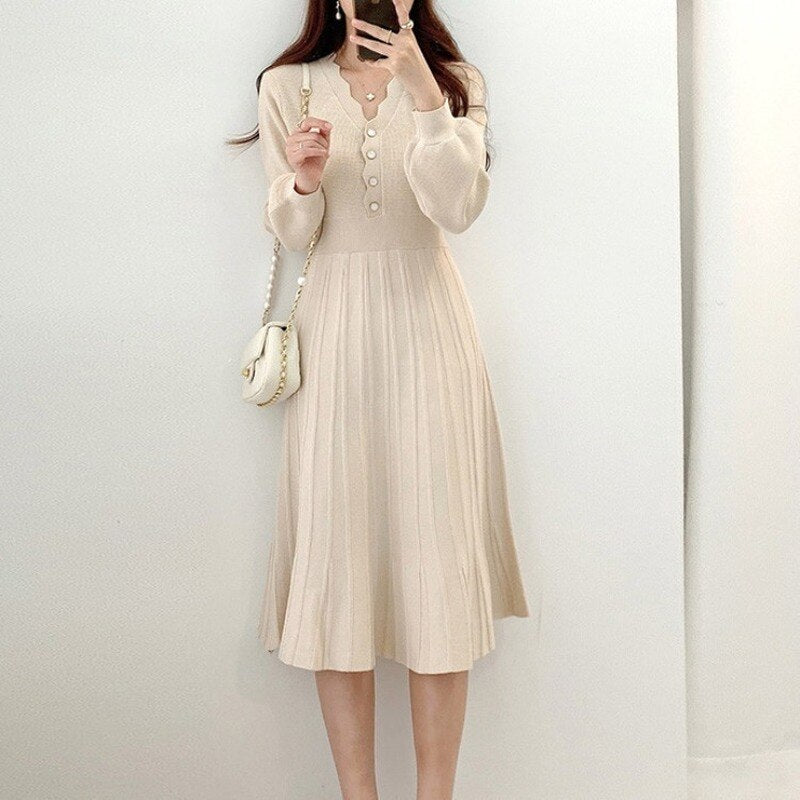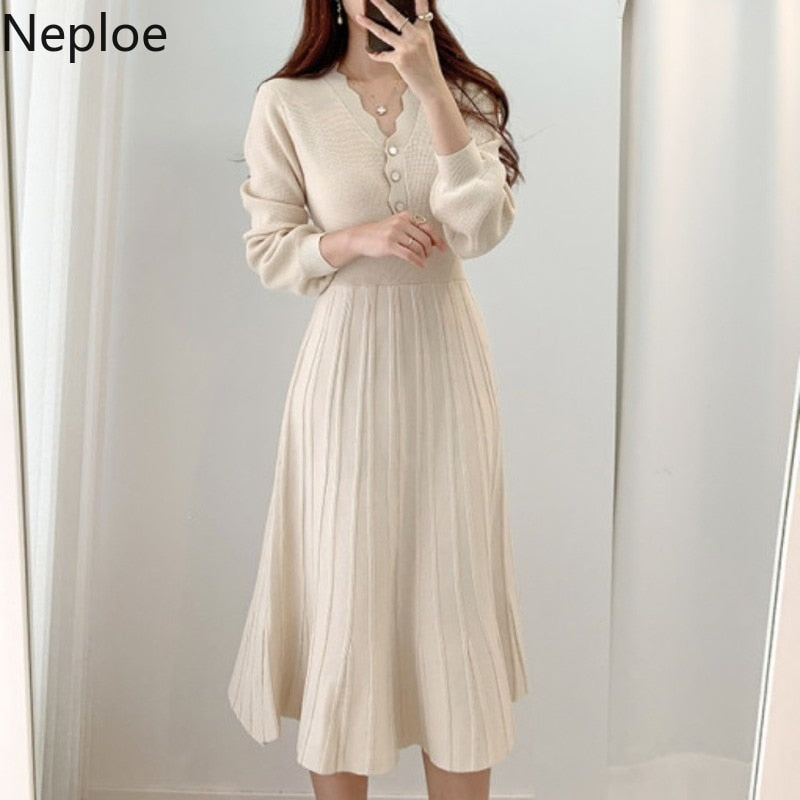 Christmas Gift V Neck Long Sleeve Midi Dress Women Button Decreation High Waist A Line Slim Femme Robe 2021 Chic Knitted Solid Vestidos