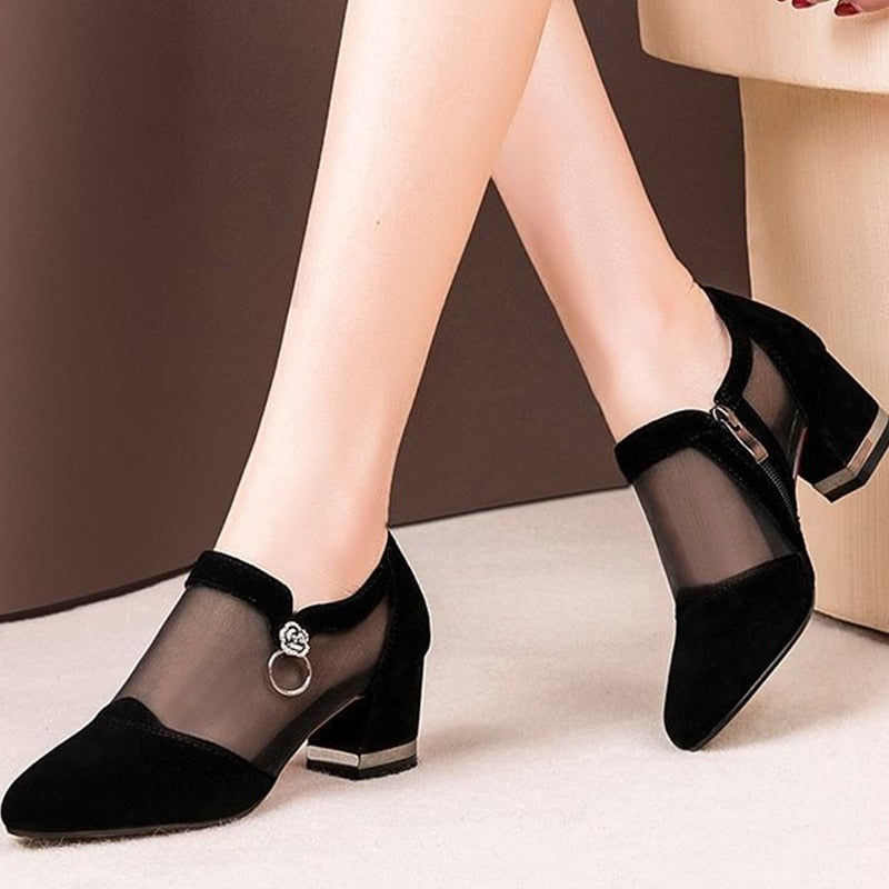 Classic Women Mesh Breathable Pumps High Heel Shoes Zip Pointed Toe Thick Heels Fashion Female Dress Shoes Elegant Footwear