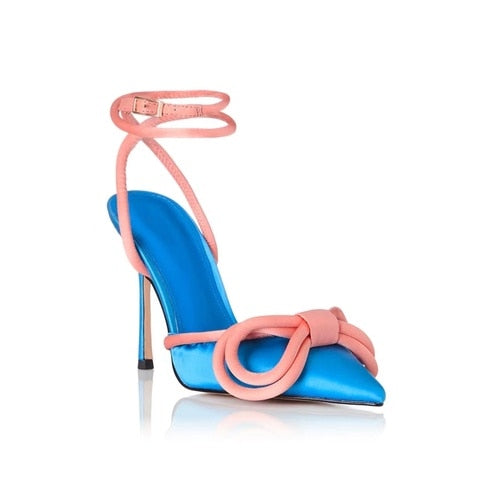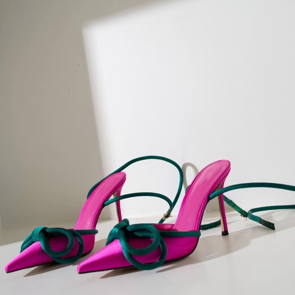 Colorblock Pointed Toe Bow Stiletto Mid-heel High Heels Women's Sandals