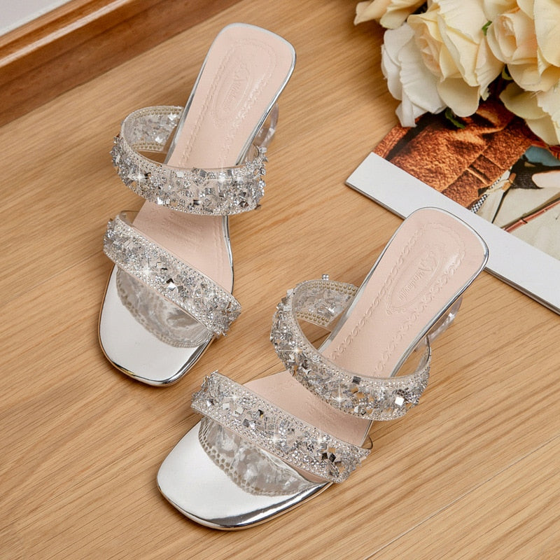 Comemore 2021 Shiny New Fashion Thin High Heels Sandals Open Toe Platform Clog Party Sandals Woman Rhinestone Silver Slippers 34