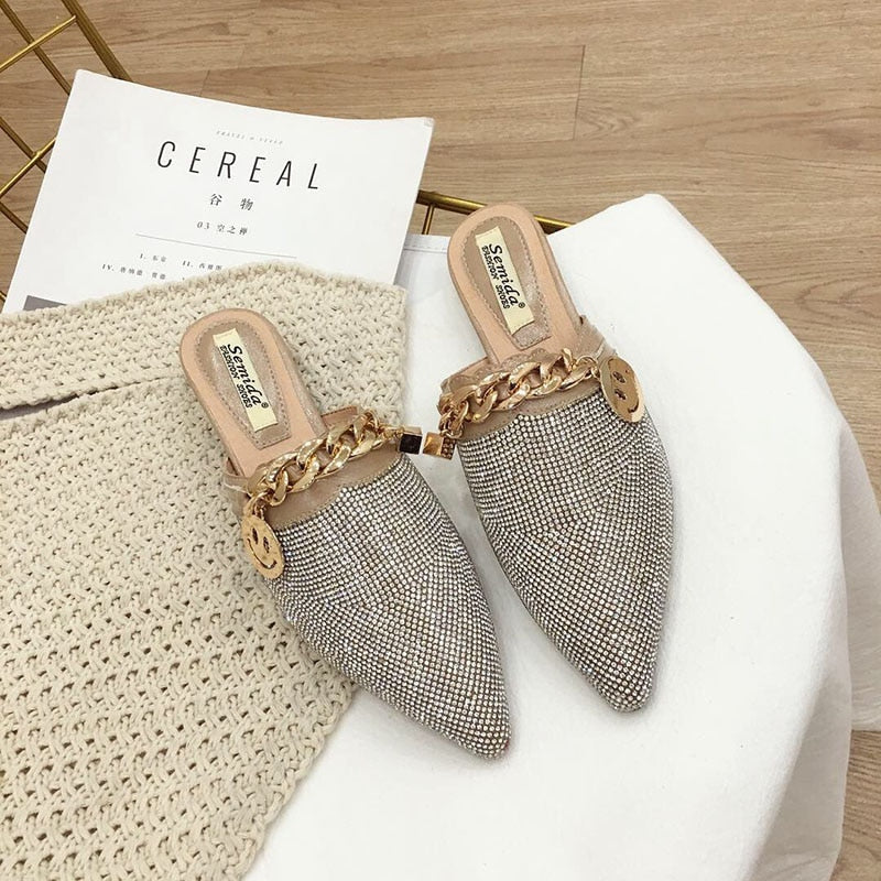Comemore Slippers Female 2022 Metal Chain Rhinestone Shiny Bling Flat Sandals Slip-on Evening Party Slides Shoes Silver Pumps 43