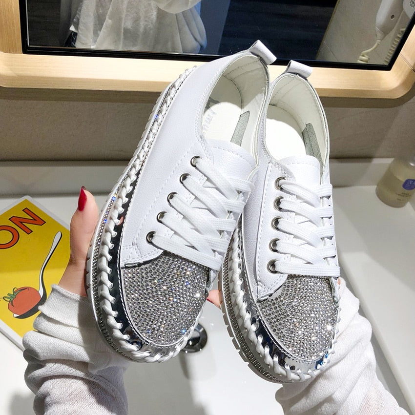 comemore Women Crystal Shoes 2021 Spring Fashion Bling Lace Up Ladies Casual Comfortable Round Toe Platform Sneakers White Shoes