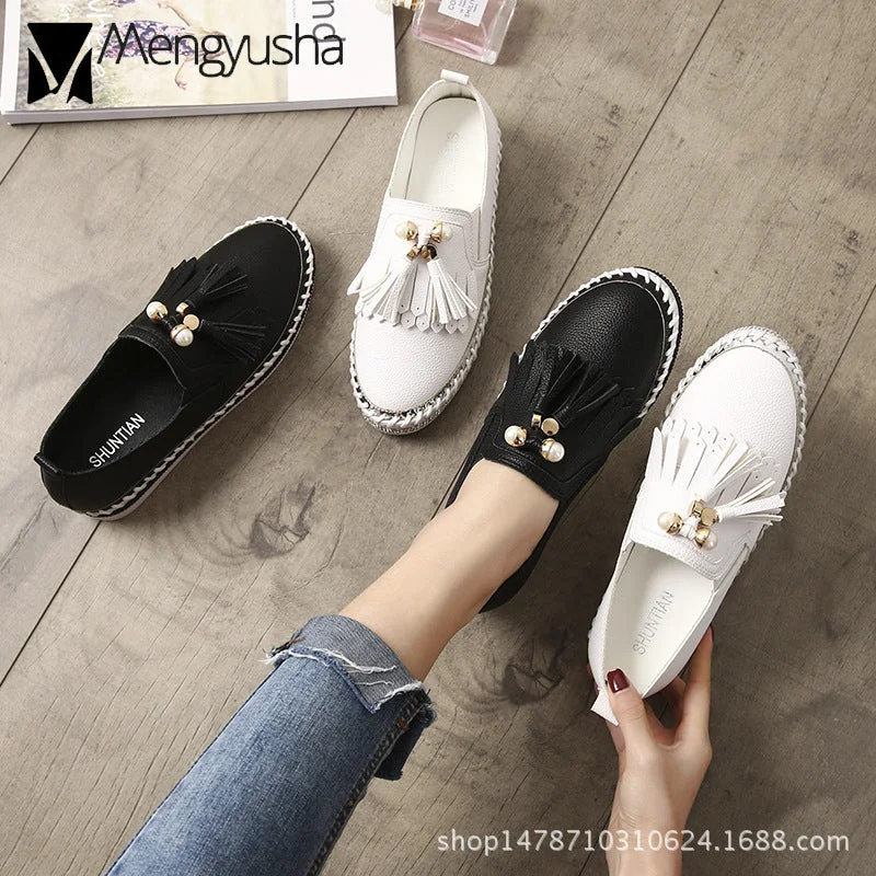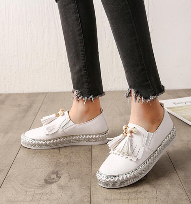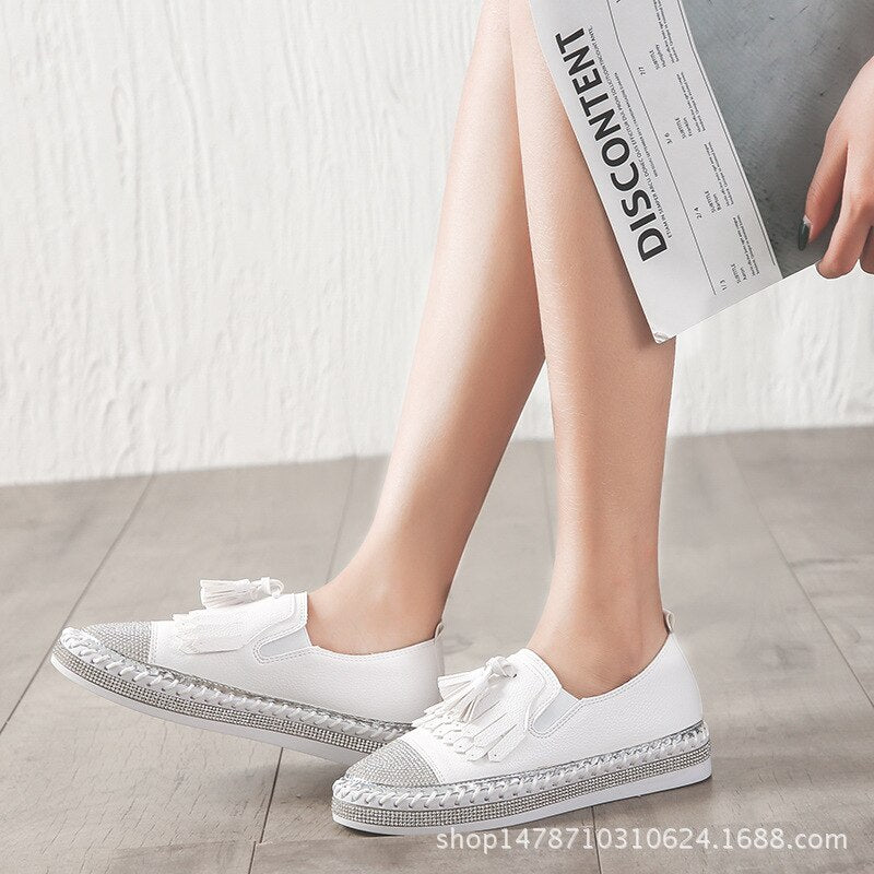 Crystal Small White Leather Shoes Women Tassel Espadrilles Creepers Fishermen Flats Ladies Loafers Handmade Leather Moccasins