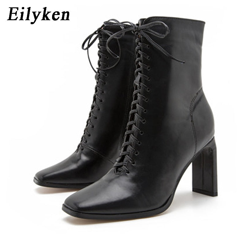 Eilyken Size 35-42 Women Square Head Ankle Boots Fashion Cross Strap Square High Heels Winter Shoes Zipper Office Lady Boots