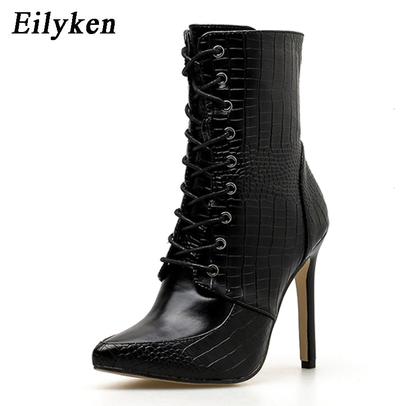 Eilyken Snakeskin grain Ankle Boots For Women High heels Fashion Pointed toe Ladies Sexy shoes 2022 New Lace-Up Boots Size 35-42
