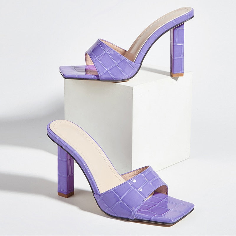 Elegant Purple High Heels Slippers For Women Ladies Fashion Snake Print Leather Square Toe Sandals Summer Party Shoes Slides