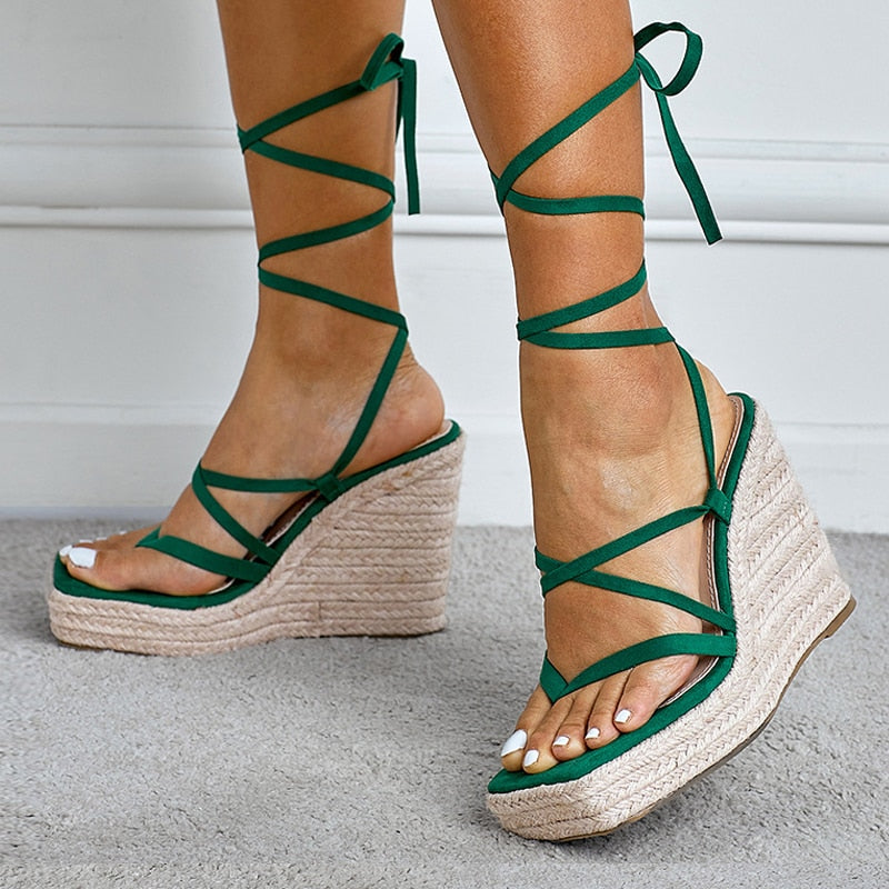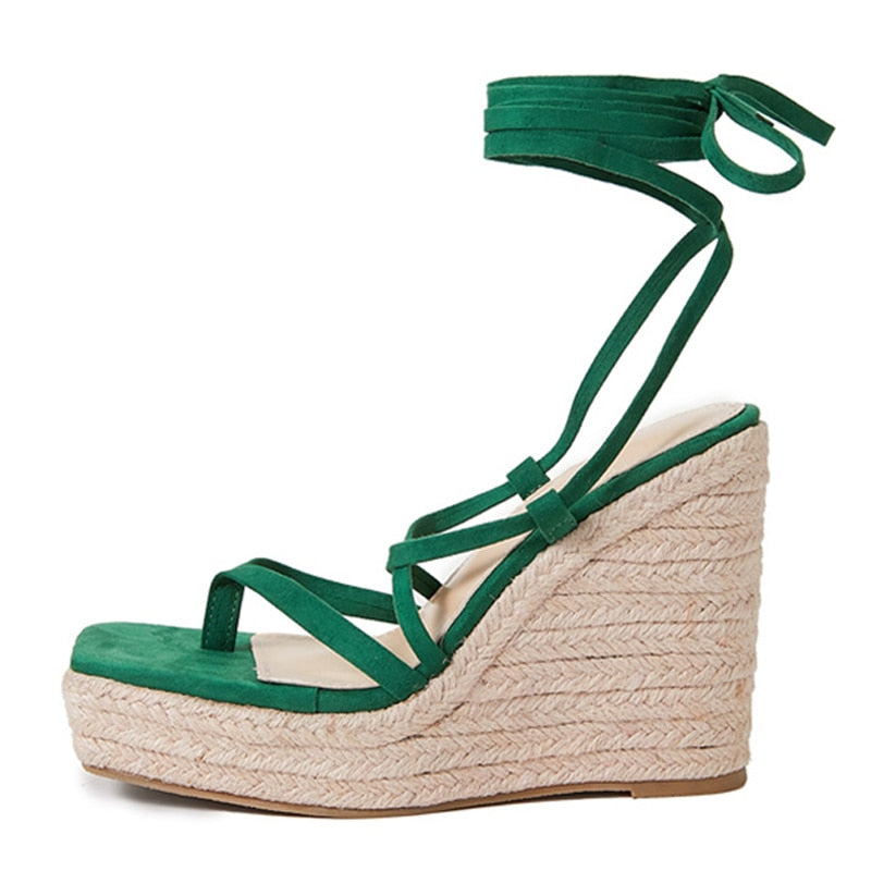 Fashion 12.5CM Wedges Heels Platform Sandals Women Summer Green Narrow Band Open Toe Ankle Lace-Up Party Dress Shoes Plataforma