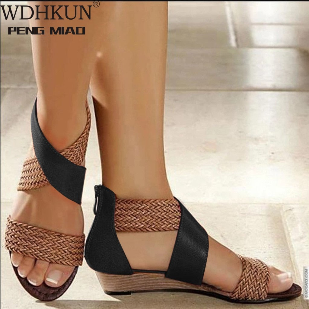 Fashion New Fish Mouth Leather Canvas Women Weave Wedge Heel Shoes Zipper Sandals Casual Beach Sandals Roman Shoes