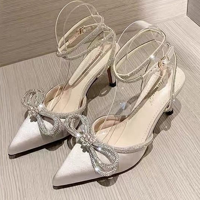 Fashion Women's High Heel Sandals Rhinestone Woman Pump Crystal Bowknot Ankle Strap Ladies Prom Shoes Women 2022 Female Footwear