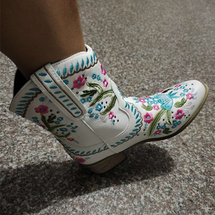 Flower Embriodery Cow Boy Boots for Women Ankle Shoes Thick Heel Short Boots 2021 Spring New Female West Boots