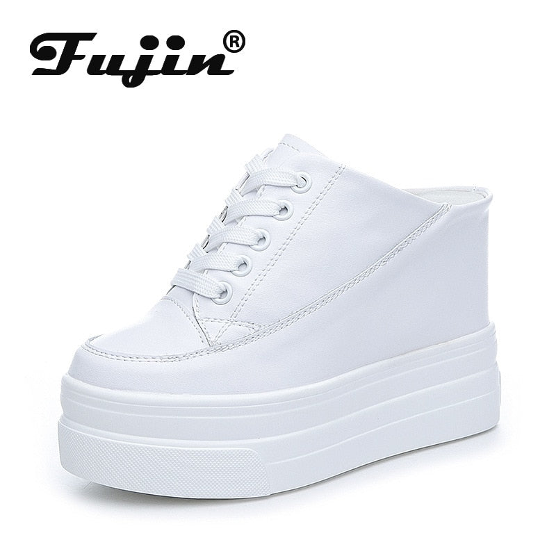 Fujin 11cm Platform Wedge Women Shoes Mules Genuine Leather Hidden Heel Women Summer Shoes Slides Sandals Slippers Spring Autumn