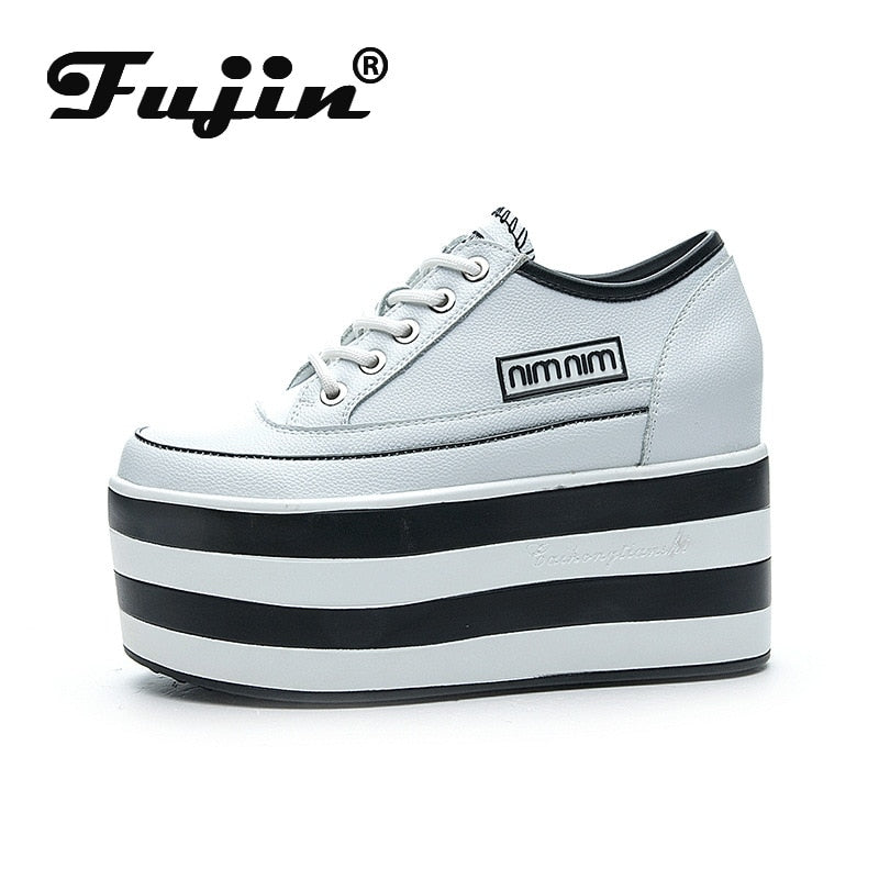 Fujin 12cm Genuine Leather Women Shoes Platform Wedge Sneakers Chunky Hidden Heel High Women Casual Shoes Spring Summer Loafers