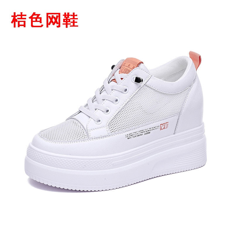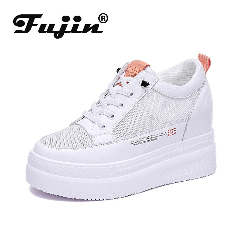 Fujin 8.5cm Platform Wedge Sneakers Height Increased Shoes Genuine Leather for Women Spring Autumn Air Mesh Summer Shoes White