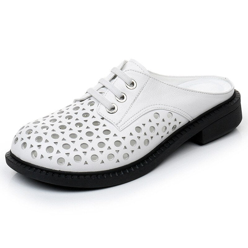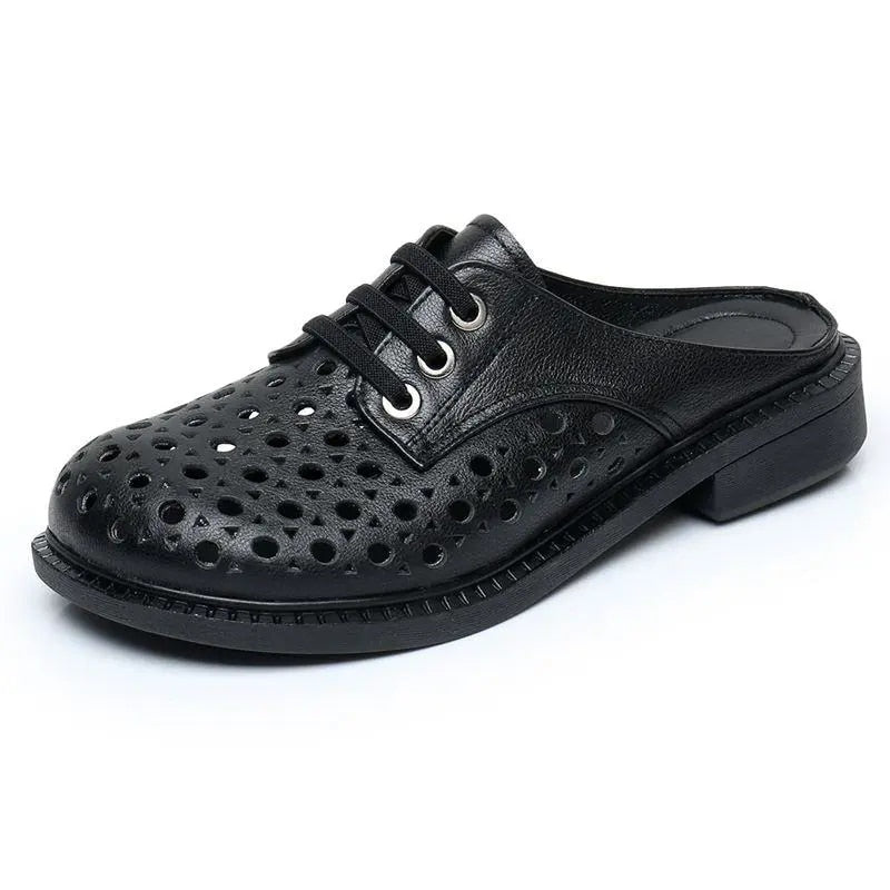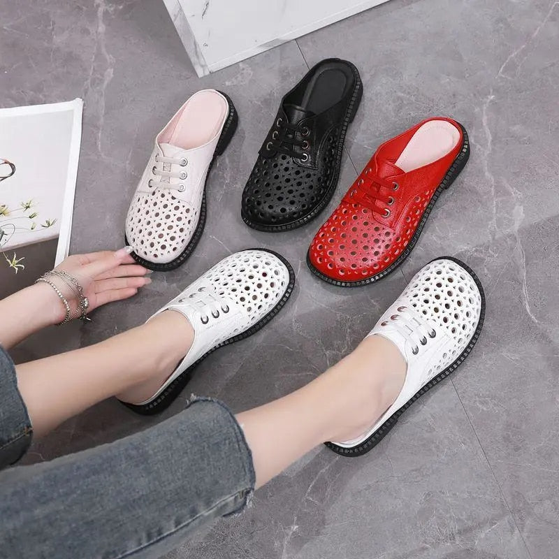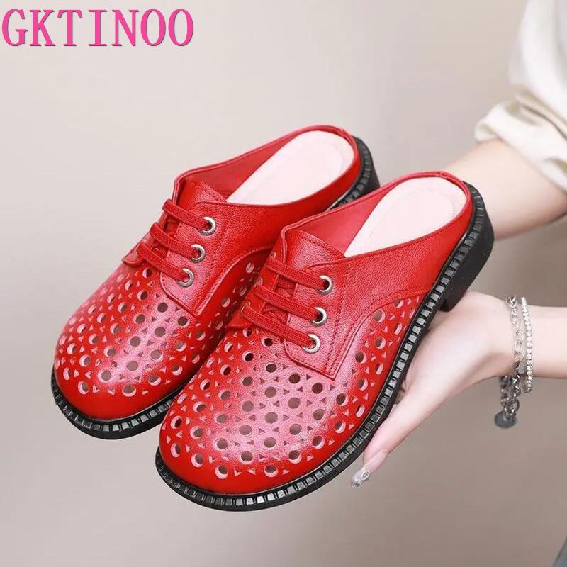 GKTINOO 2022 New Summer Round Toe Hollow Genuine Leather Slippers Casual Sandals Low Heel Shoe Slippers Women Sandals Large Size