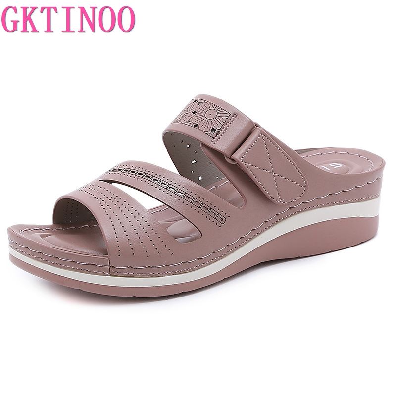 GKTINOO 2022 Women Slippers, PU Leather Shoes Comfy Platform Flat Sole Ladies Casual Soft Sandal Shopping Flat Sole Sandal