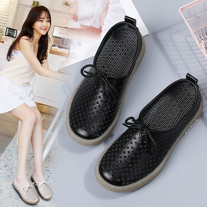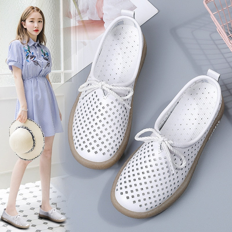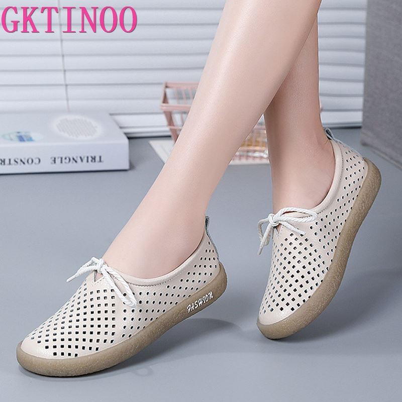 GKTINOO New Breathable Genuine Leather Summer Shoes Woman Flats Hollow Comfortable Ladies White Loafers Soft Casual Shoes