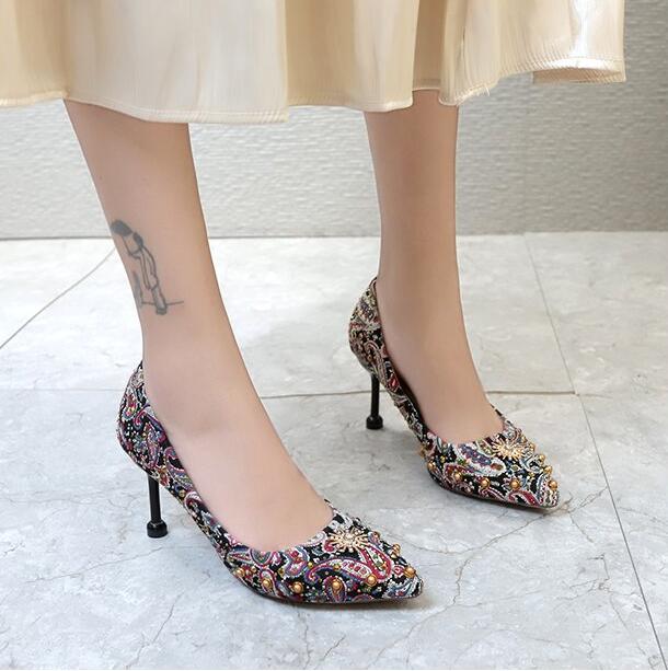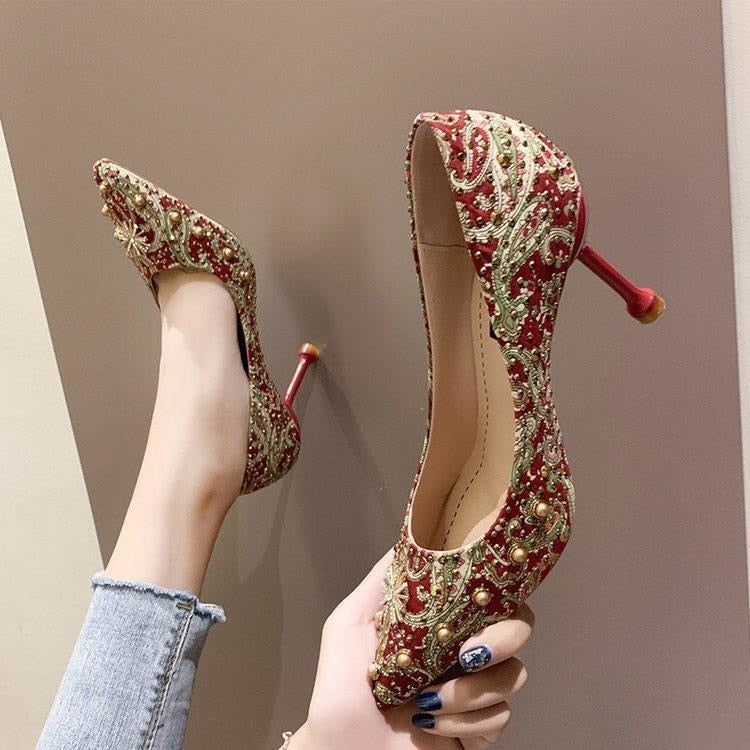 glitter crystal metal snow rivets single shoes red/black women wedding shoes pointed toe thin high heels slip on pumps stilettos