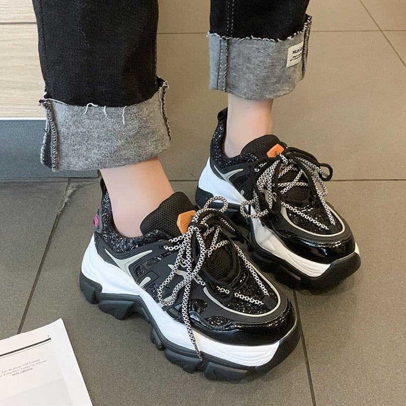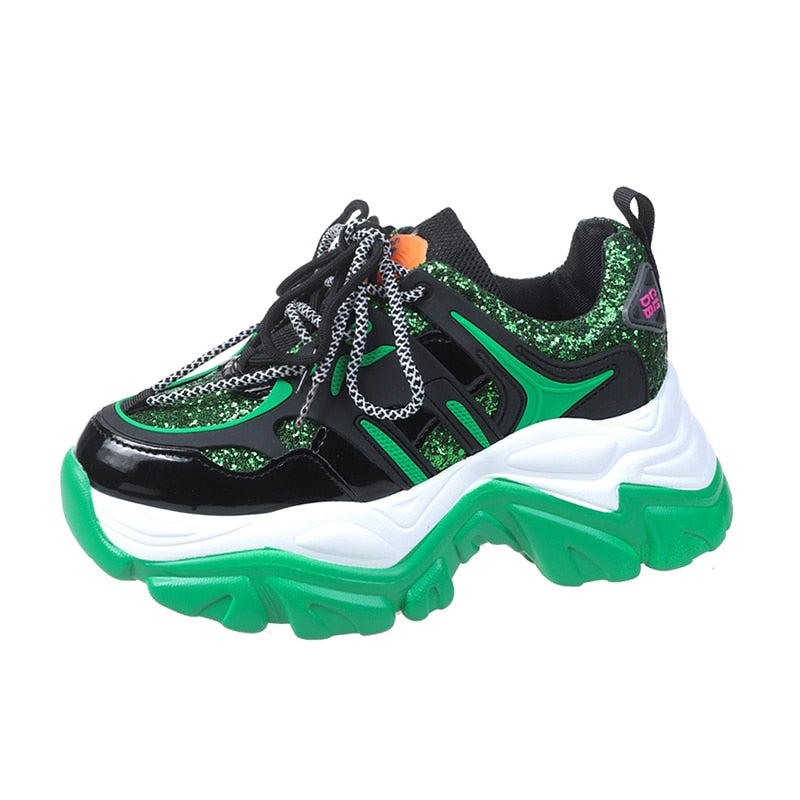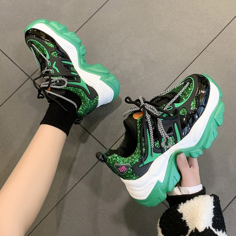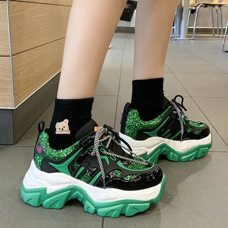 Green Glitter Basketball Sneakers For Women Fashion Platform Chunky Sneakers Woman 2022 Spring Thick Bottom Sports Shoes