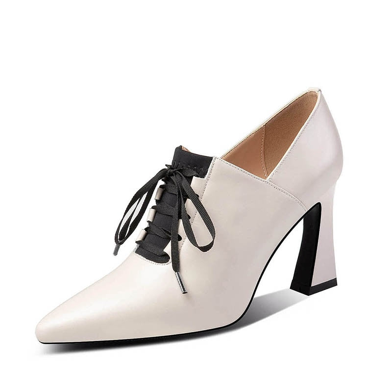 High Heels Hoof Pumps Women Lace Up Pumps Cow Leather Shoes Female Fashion Pointed Toe OL Shoes Women Autumn 2019 New