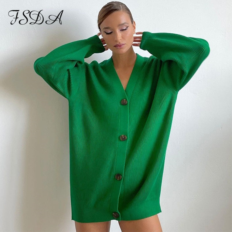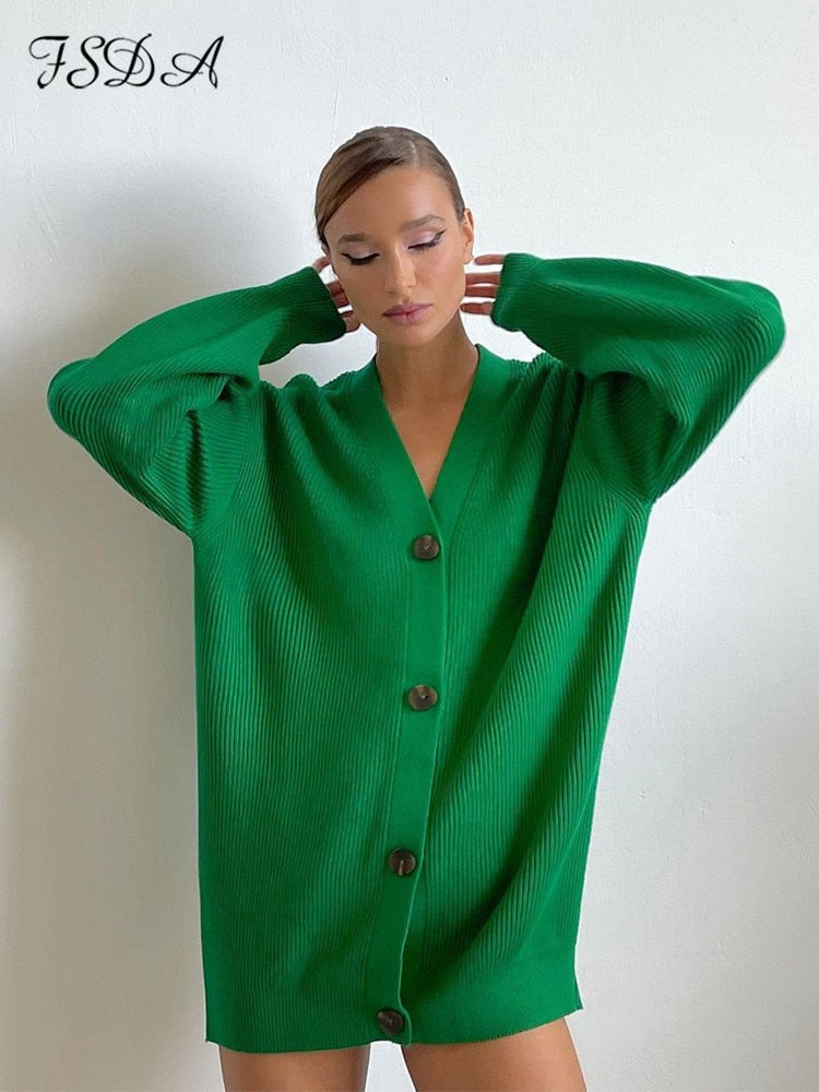 2022 Autumn Winter Green Cardigan Oversized Women Long Sleeve Button Casual Loose Knitted Sweater Fashion